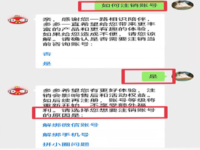 4、根据客服提示回答问题,如确定注销当前咨询账号、选择注销账号的原因。