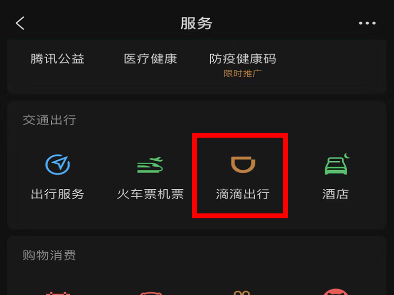 1、打开微信,进入“服务”界面,点击“滴滴出行”,进入“滴滴出行”界面。