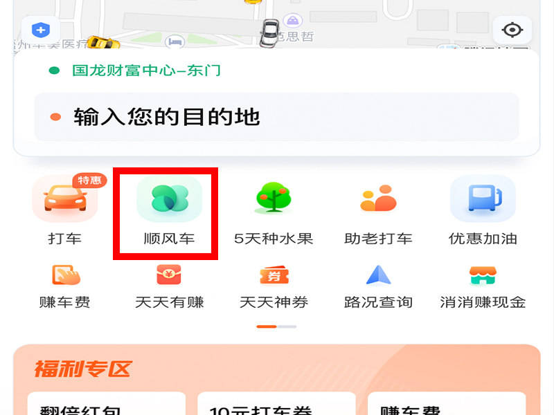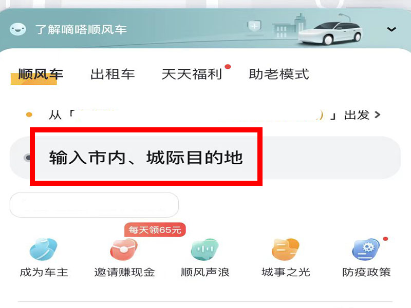 3、进入“顺风车”界面后,输入目的地和出发地,再点击“预约顺风车”即可。