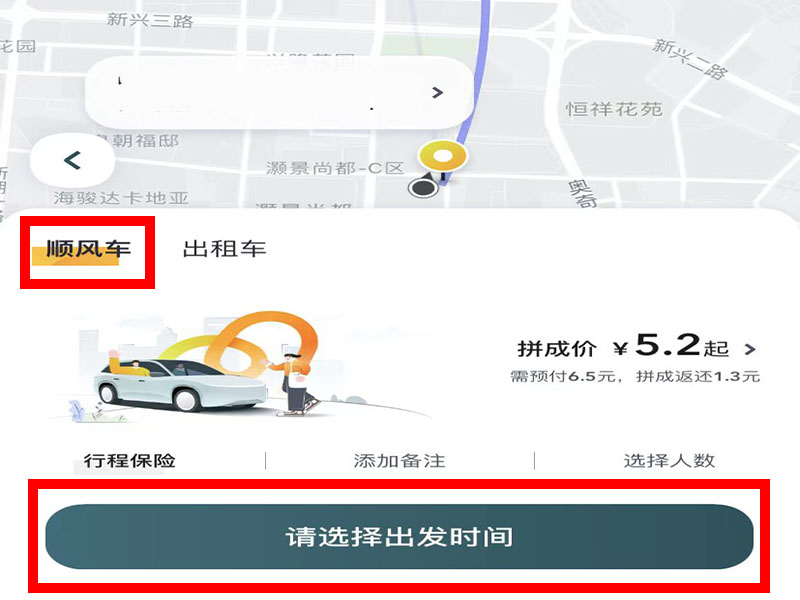 2、进入打车界面后,点击“顺风车”,再选择出发时间即可。