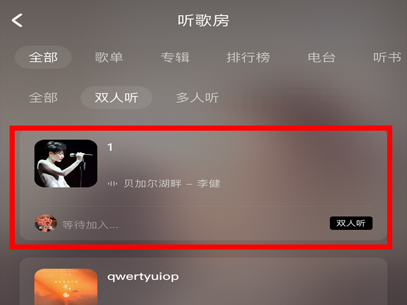 3、进入“一起听”界面后,进入“双人听”的听歌房,进入听歌房界面。