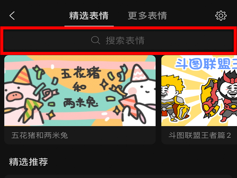 2、进入“精选表情”界面后,在上方的搜索栏中输入想要下载的表情包,进入“搜索结果”界面。