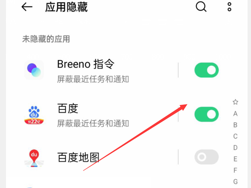 3、下滑页面,找到需要隐藏的应用,打开其后面的开关即可。