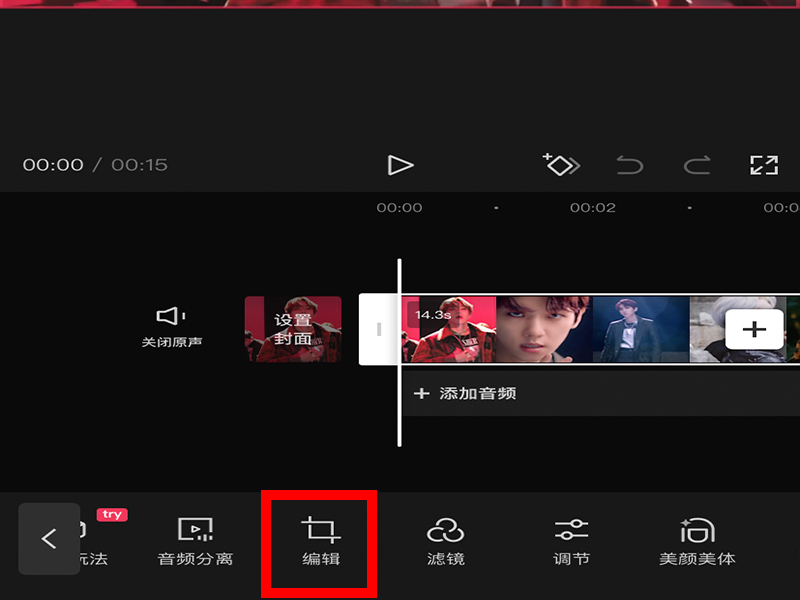 2、进入视频“剪辑”界面后,点击“编辑”,进入“编辑”界面。