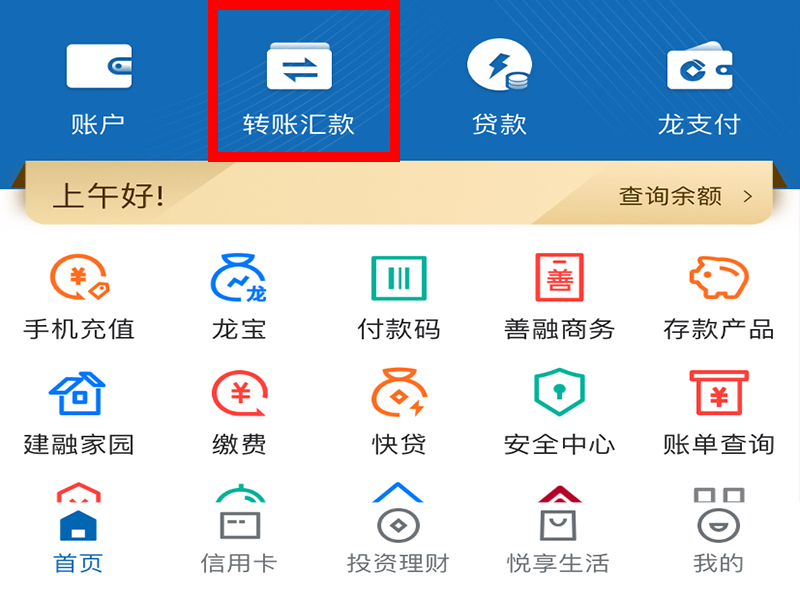 1、打开中国建设银行app,进入“首页”界面,再点击界面上方的“转账汇款”。
