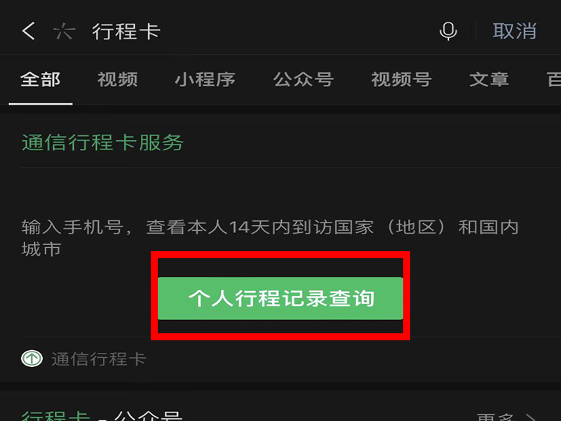 2、打开微信,在上方的搜索栏中搜索“行程卡”,进入搜索结果界面。