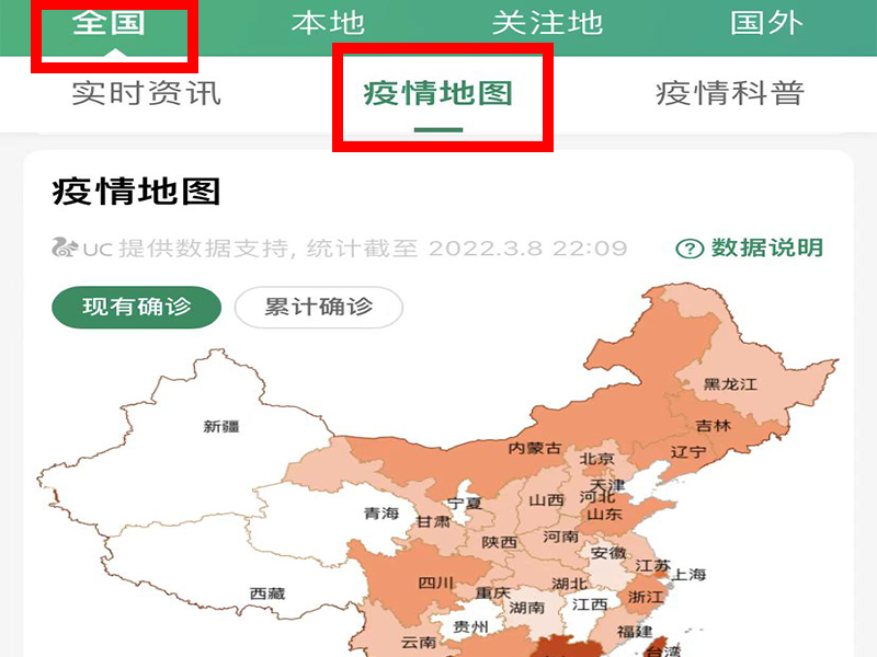 2、进入“全球疫情服务”界面后,点击“全国”界面中的“疫情地图”即可。
