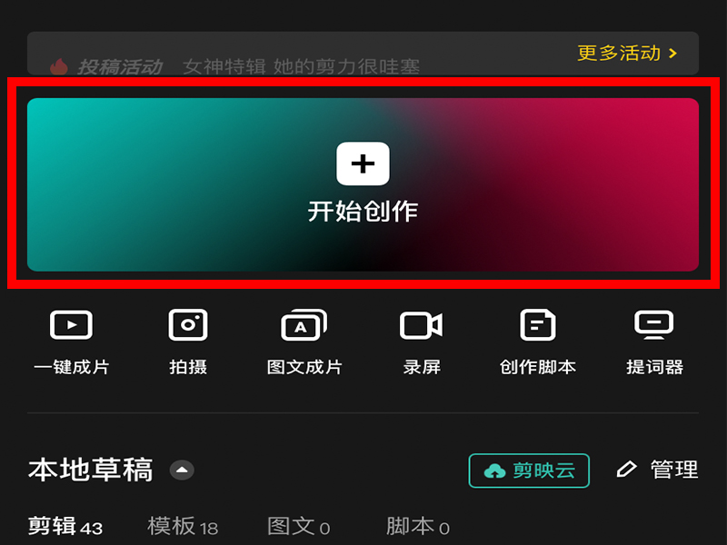 1、打开剪映,点击界面中间的“开始创作”,进入视频选择界面。