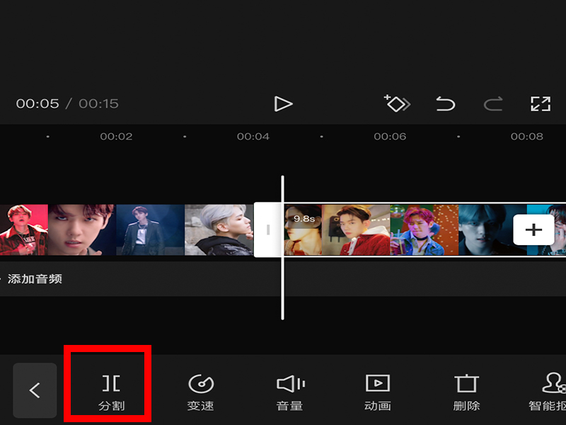 3、进入“剪辑”界面后,点击“分割”,将视频进行分段。