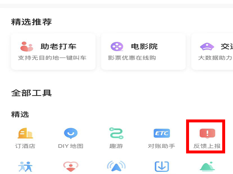 1、打开高德地图,进入“更多工具”界面后,点击“反馈上报”,进入“反馈上报”界面。