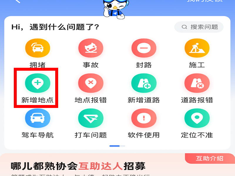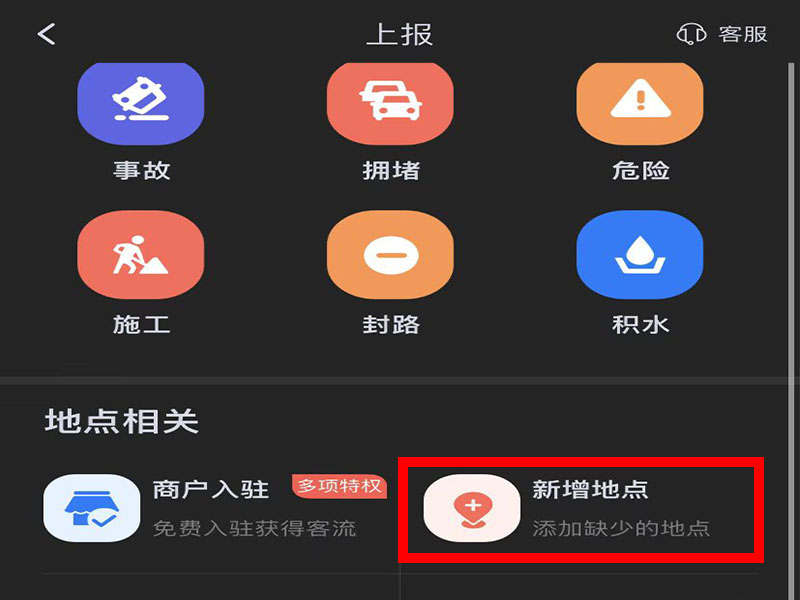2、进入“反馈上报”界面后,点击“新增地点”,进入“新增地点”界面。