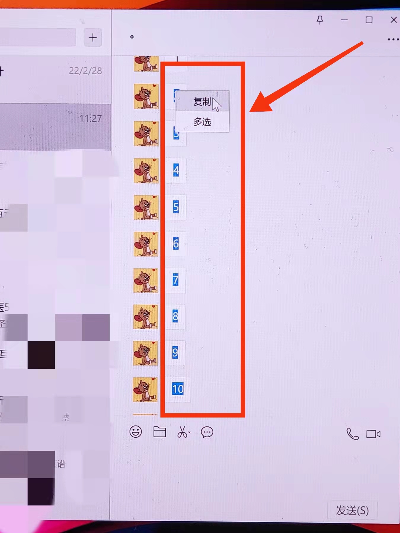3、接着在微信对话框选择需要保存的记录,按鼠标右键选择复制。
