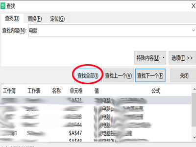 3、单击“查找全部”,即可以将本文档中带有“电脑”二字的都查找出来。