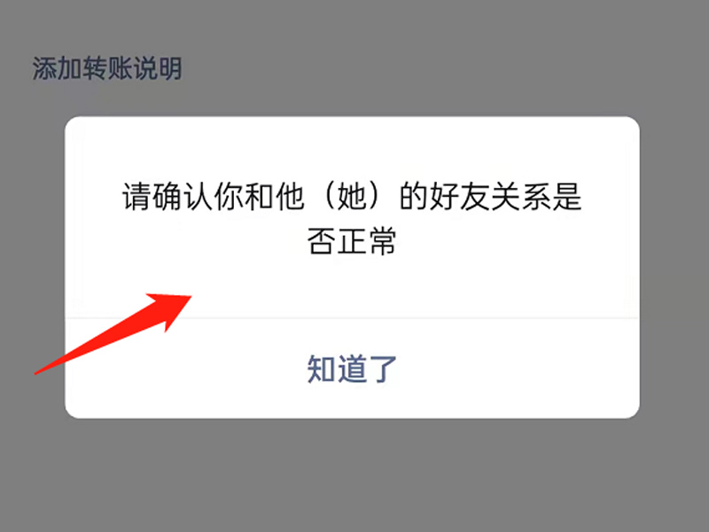 4、向好友进行转账,在输入金额点击确定的时候如果显示好友关系不正常,表示被对方拉黑了。