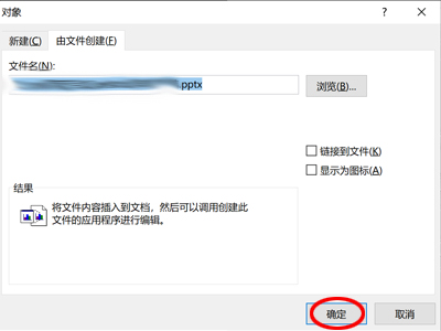5、点击下方的“确定”,即可以将PPT插入到word中,双击PPT即可以进行放映。