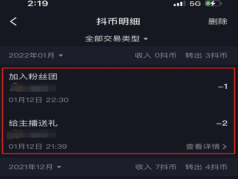 5、在抖币明细页面上,即可查看到抖币具体的消费明细。