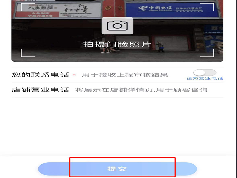 3、在商户入驻页面上,输入店铺信息,并上传店铺门脸照片,即可点击“提交”,最后等待审核通过即可。