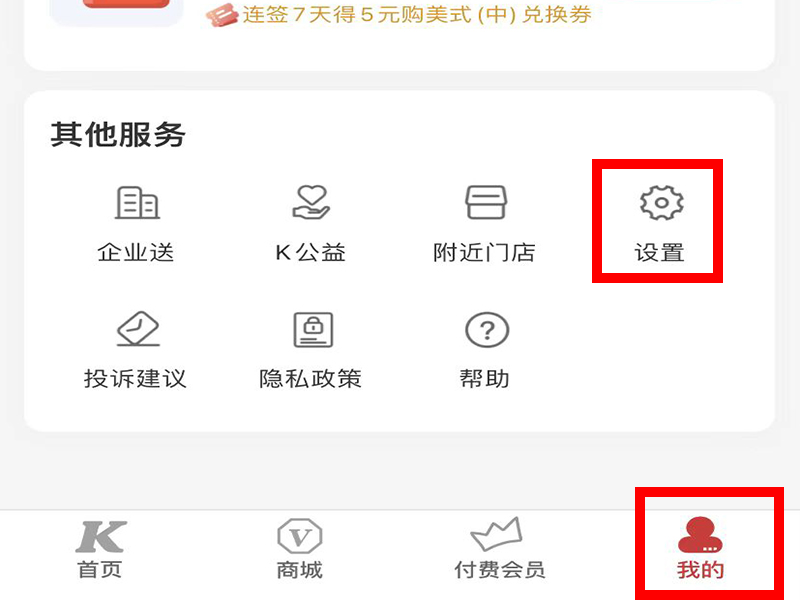 1、打开肯德基app,点击进入“我的”的界面,再点击“设置”,进入“设置”界面。