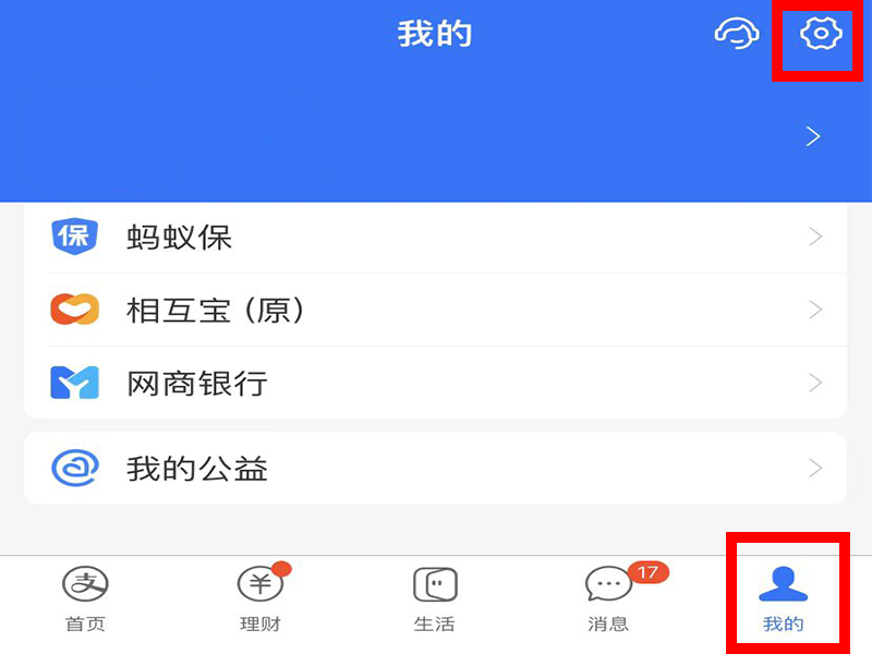 1、打开支付宝,点击进入“我的”的界面,再点击右上角的“设置”符号,进入“设置”界面。