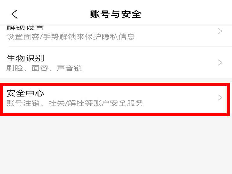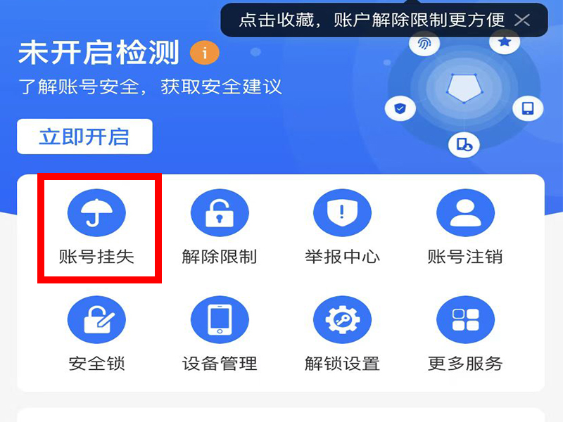 4、进入“安全中心”界面后,点击“账号挂失”,进入“账号挂失”界面。