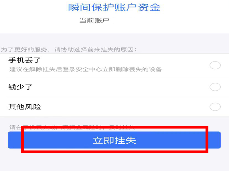5、进入“账号挂失”界面后,点击“立即挂失”即可。