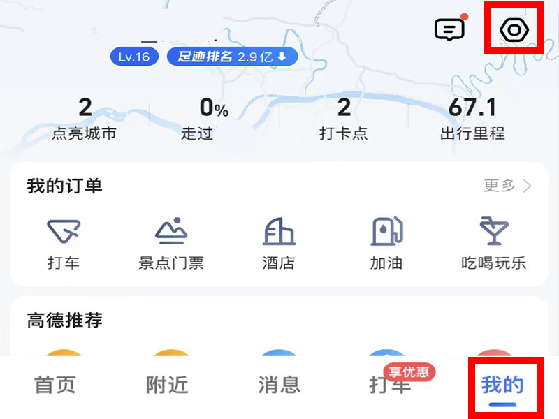 1、打开高德地图,进入“我的”的界面,点击右上角的“设置”。