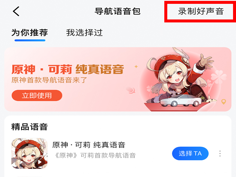4、进入“导航语音包”界面后,点击“录制好声音”。
