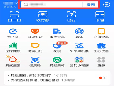 1、打开支付宝,点击上方的搜索框,进入搜索页面。