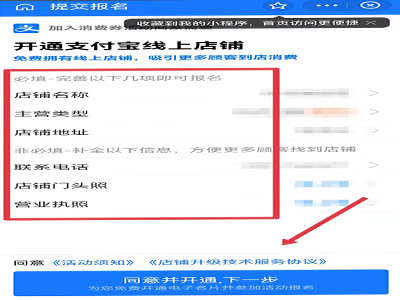 4、点击“立即报名消费券”,完善店铺信息,点击“同意并开通,下一步”,即可开通电子名片并参加活动报名。