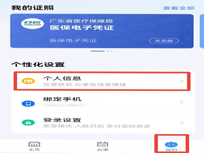3、打开粤省事小程序,切换到“我的”页面,点击“个人信息”。