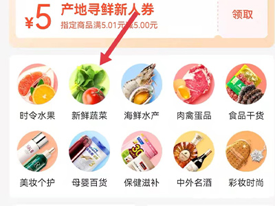 1、打开盒马app,在首页的信息栏中,点击“新鲜蔬菜”,进入页面。