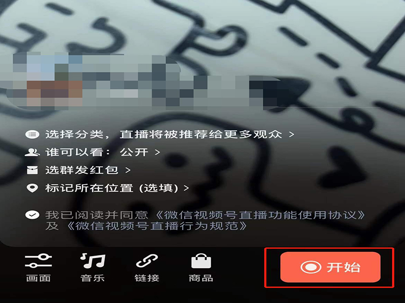 5、在发起直播页面上,调整好相关的直播信息,即可点击“开始”进行微信直播。