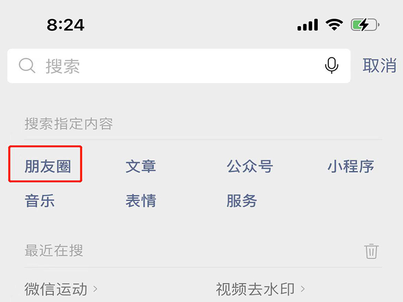 2、在搜索页面上,点击“朋友圈”进入朋友圈搜索页面。