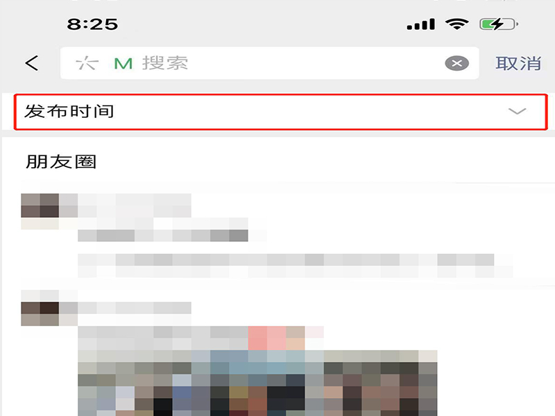 4、在个人的朋友圈页面上,点击“发布时间”,进入选择发布时间页面。