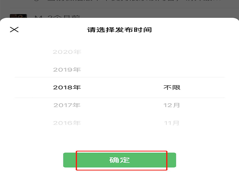 5、在选择发布时间页面上,选择三年前的年份,点击“确定”,即可进入三年前的朋友圈页面。