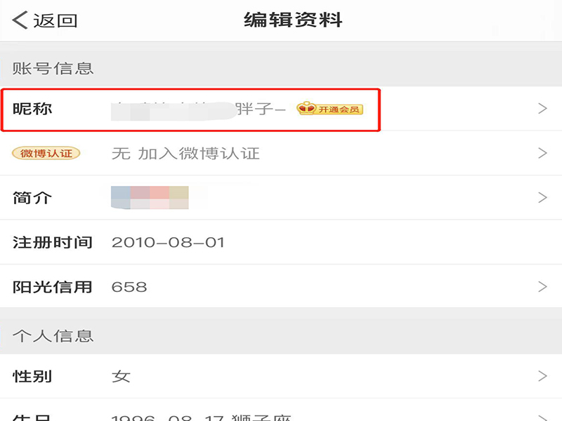 3、在编辑资料页面上,点击“昵称”,进入修改昵称页面。