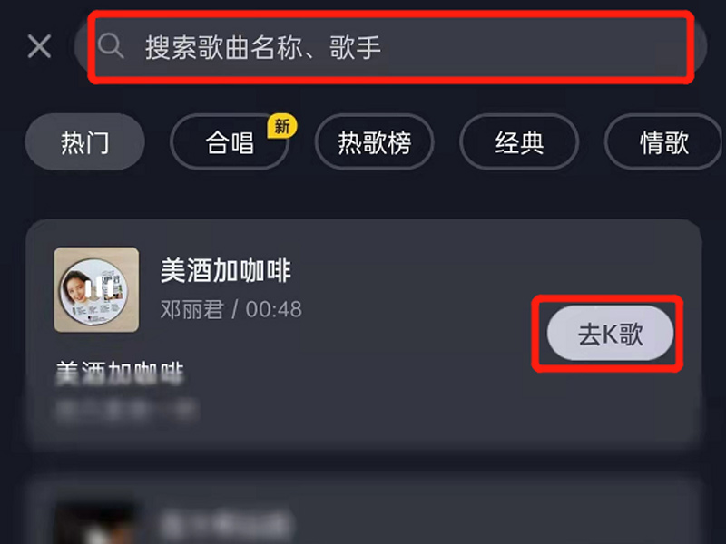3、点击搜索框,搜索需要的歌曲,点击歌曲后面“去K歌”。