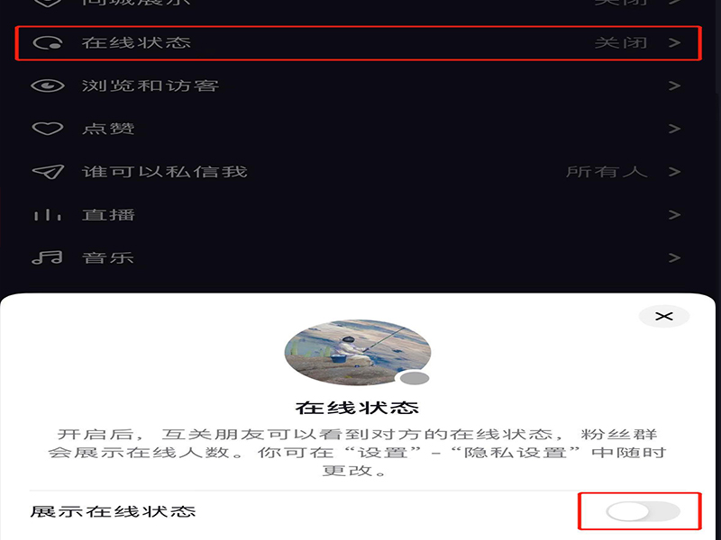5、在隐私设置页面上,选择“在线状态”,点击“展示在线状态”,即可开启在线状态展示。