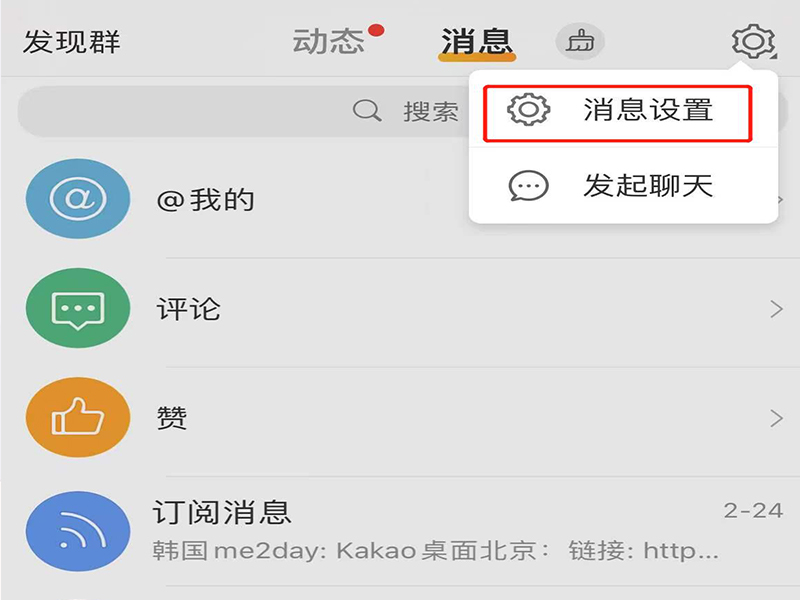 2、在微博消息页面上,点击右上角的齿轮图标,再点击“消息设置”,进入消息设置页面。