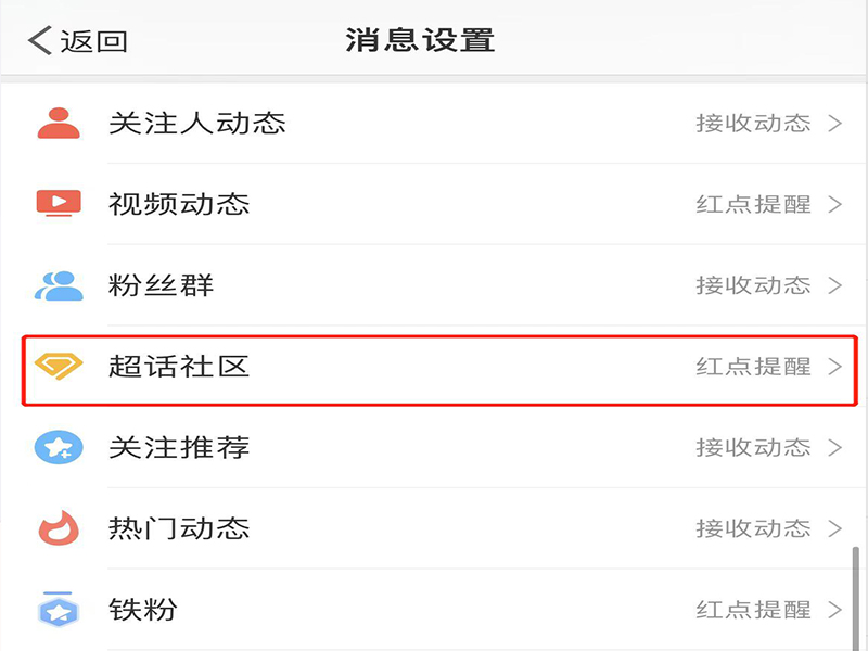 3、在消息设置页面上,点击“超话社区”,进入超话社区设置页面。