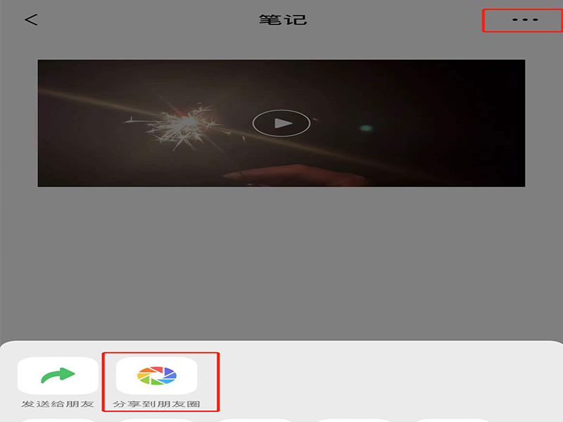5、在笔记页面上,点击右上角图标打开工具栏,再点击“分享到朋友圈”,即可将原画质视频分享至朋友圈。