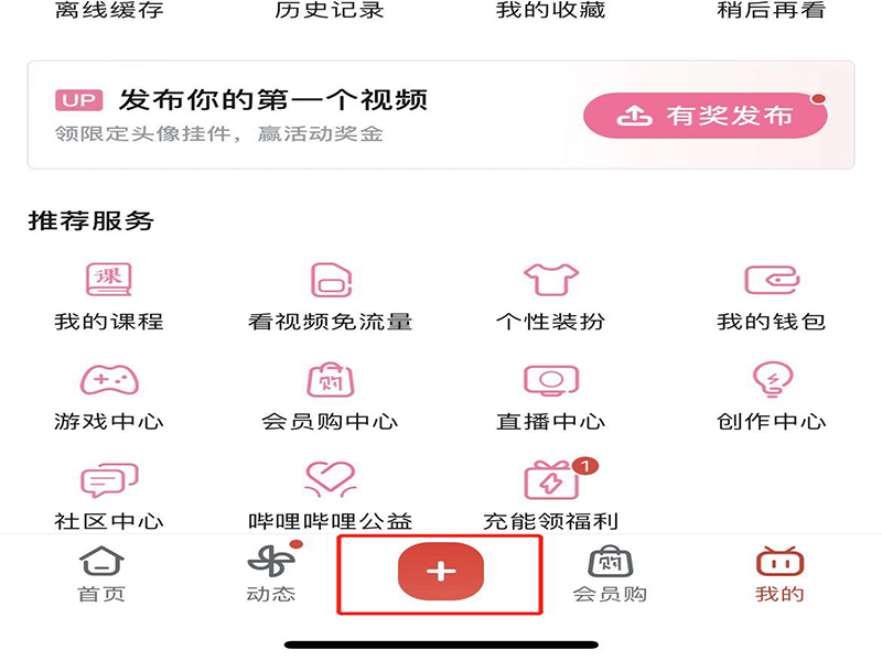 1、打开bilibili哔哩哔哩,在首页上,点击下方的“+”图标,进入视频筛选页面。