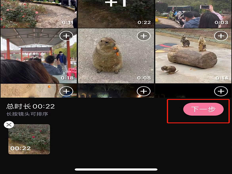 2、在视频筛选页面上,选择需要投稿的视频,并点击“下一步”添加进视频编辑页面中。