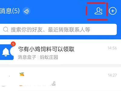 1、打开支付宝,切换至消息页面,点击右上角的通讯录标志。