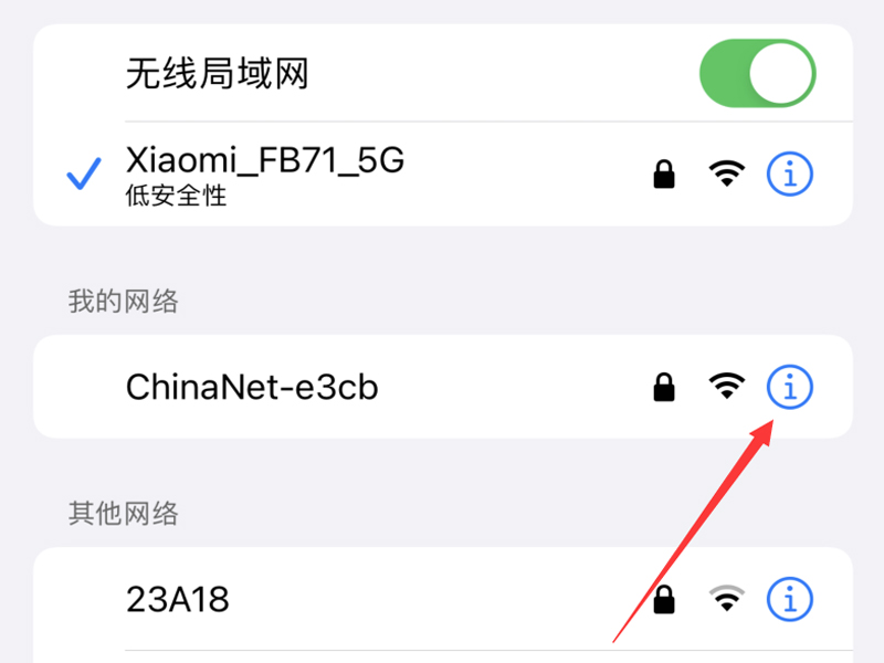 2、点击wifi名称后面的感叹号选项,进入wifi的详情页面。