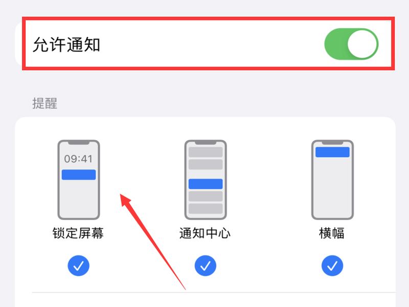 3、打开“允许通知”的开关,并且勾选“锁定屏幕”选项即可。