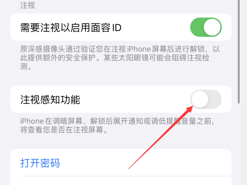 苹果手机响铃拿起来铃声变小可以通过开启手机中的注视感知功能来实现,具体的打开步骤如下所示: