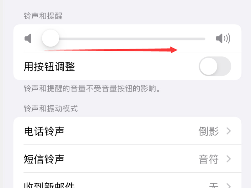 2、把“铃声和提醒”下方的调节条向右滑动调大音量即可。