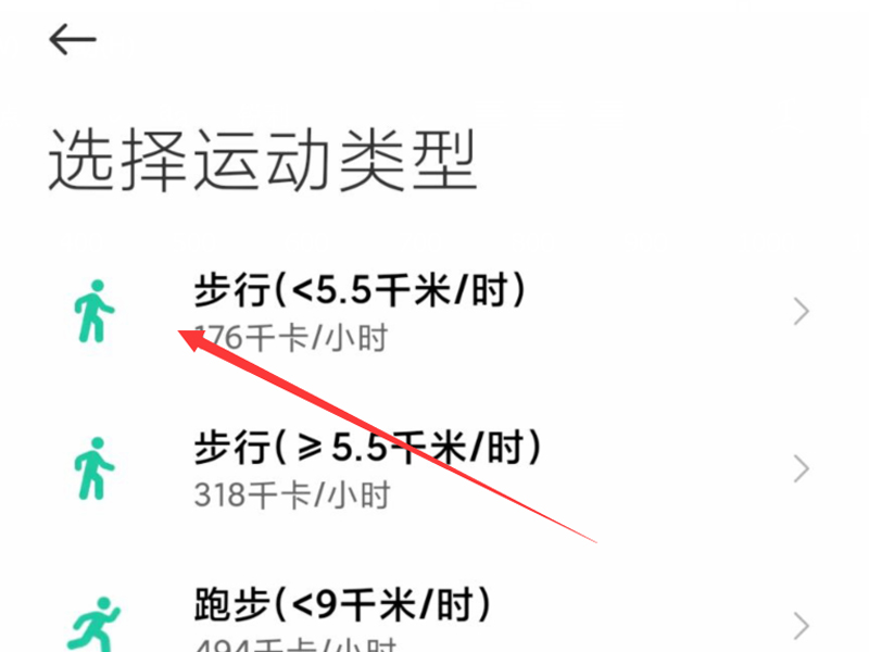 3、选择“步行”选项,手动添加步数进行校正即可。