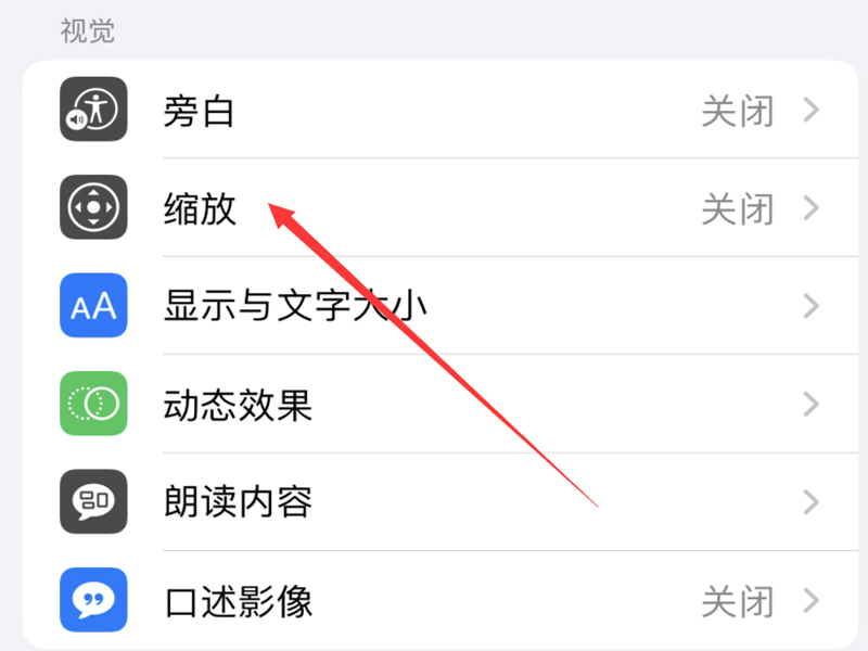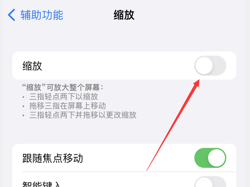 3、关闭“缩放”的开关,苹果手机屏幕超大字体的模式就会退出来。